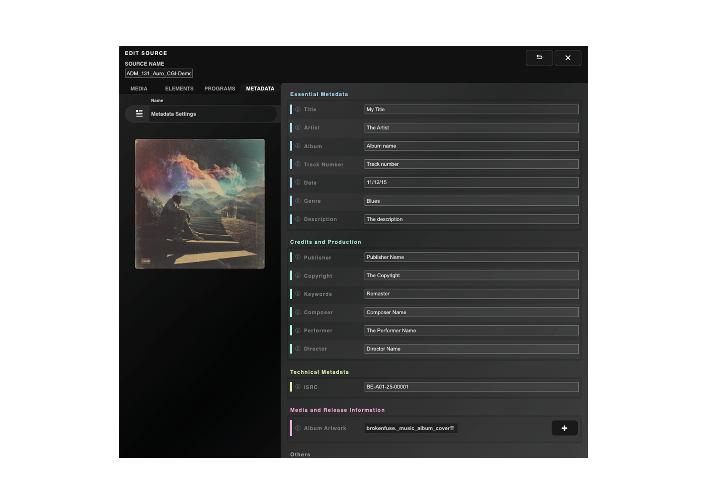 A source can include metadata defined in the Metadata Tab. The original file metadata from .wav or .bwf files, including the cover image, can be automatically parsed by enabling “Copy Metadata from File” in the global settings (see Chapter 3.9).